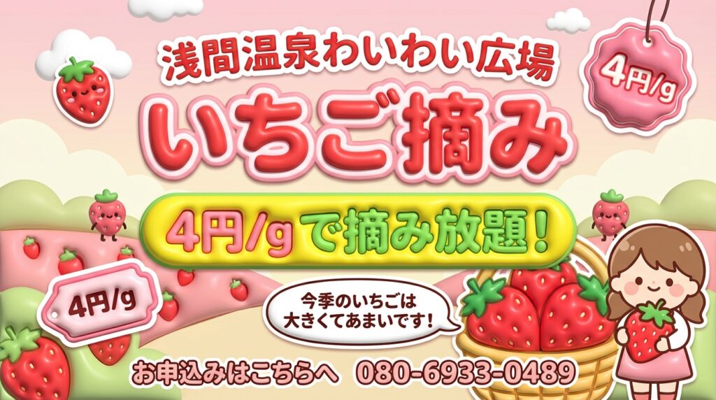 年中開園しております!浅間温泉で温泉で温まった後に美味しいイチゴ体験しませんか?おまちしております(*’▽’)
